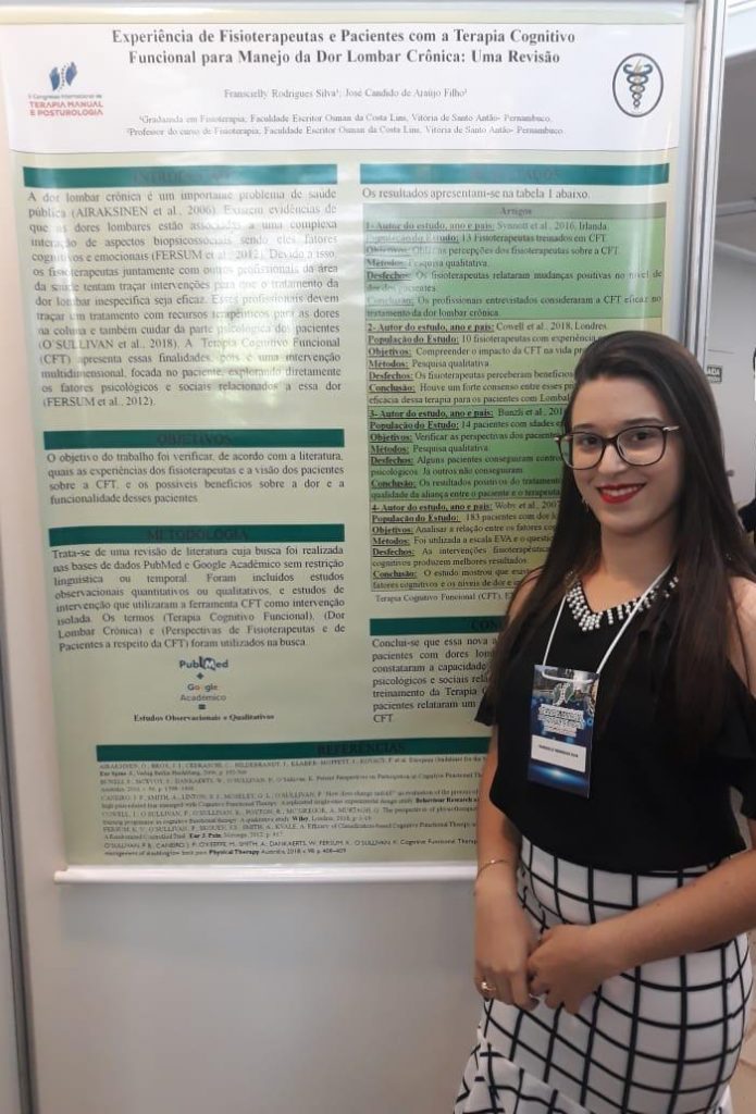 A segunda publicação ocorreu também no livro Fisioterapia: Princípios Fundamentais. O trabalho, que faz parte do capítulo 8, teve título “Experiência de Fisioterapeutas e Pacientes com a Terapia Cognitivo Funcional para Manejo da Dor Lombar Crônica: Uma Revisão”. A produção foi da aluna Franscielly Rodrigues Silva.